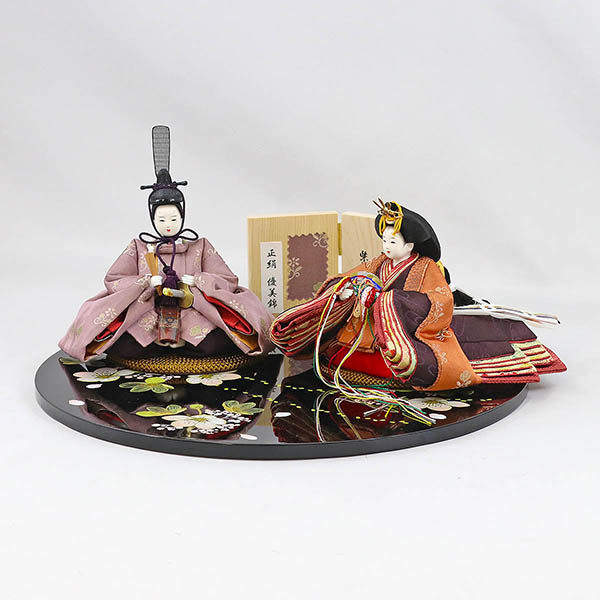 | 商品名 | 柴田家千代作 葵 正絹優美錦 薄紫/オレンジ 柳親王 裾短衣裳着 黒塗り桜柄 円形飾り台 平飾り |
